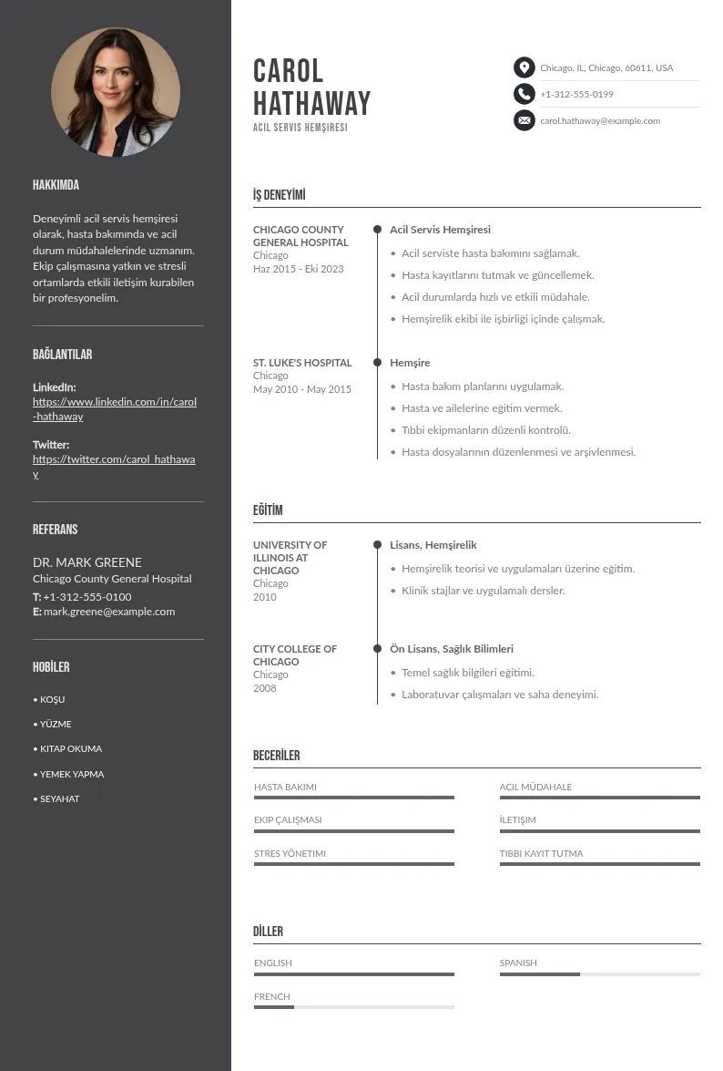 Acil Servis Hemşiresi olarak 5 yıllık deneyime sahip, çeşitli tıbbi acil durumları yönetme ve hasta bakımı konusunda yetenekli bir profesyonel için örnek bir özgeçmiş oluşturacağız.