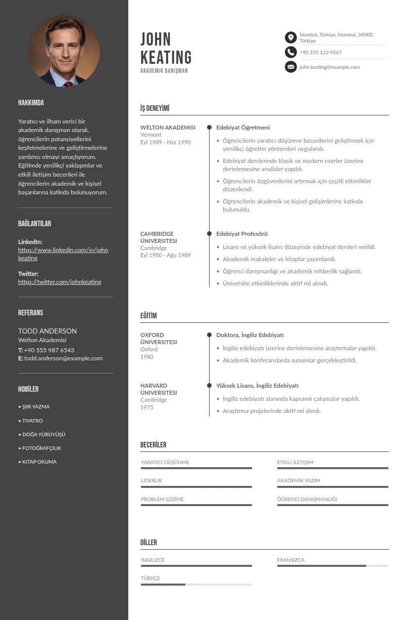 Akademik Danışman pozisyonu için başvuruda bulunurken, özgeçmişin düzeni ve yapısı sürecin kritik bir parçasıdır. Kusursuz bir CV, profesyonel profilin belirginleşmesini sağlar ve işverenlerin dikkatini çeker. Muhasebe uzmanı, eczacı veya inşaat mühendisi olsun, tüm profesyoneller gibi akademik danışmanlar da CV'lerini içerik ve sunum açısından mükemmel hale getirmeli; çünkü işverenlerin aday başına ortalama 35 saniye harcadığı düşünülürse, okunabilirlik ve düzen ön plana çıkmaktadır.