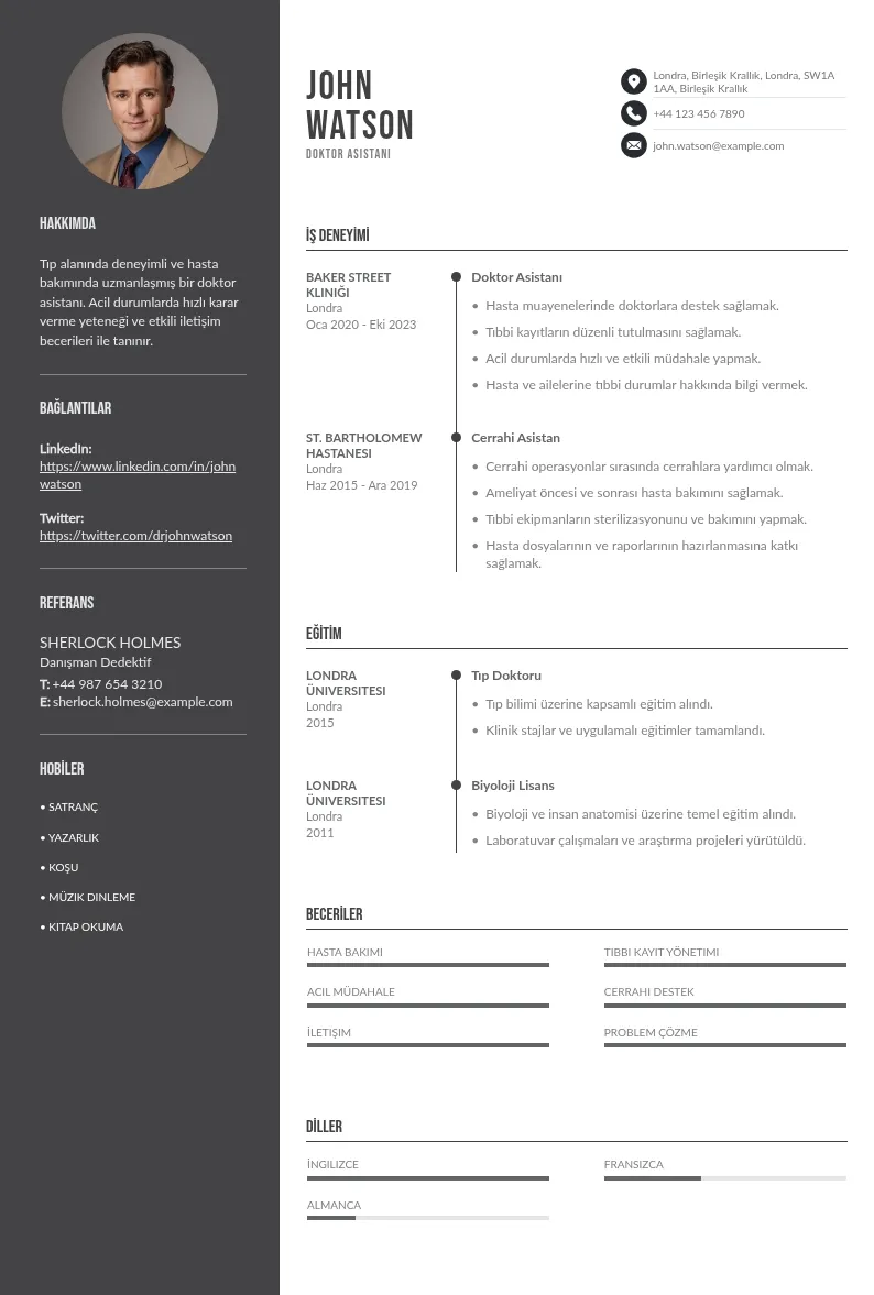 Doktor Asistanı pozisyonu için özgeçmiş örneği aşağıda sunulmuştur, kişi bu örneği kendi deneyim ve becerilerine göre düzenleyebilir.