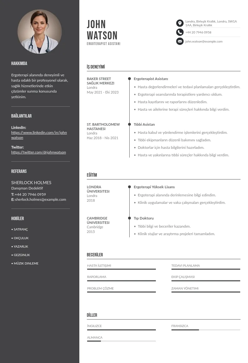 Ergoterapist Asistanı için CV, becerilerinizi Klinik Müdür, İK Uzmanı ve Bölüm Şefi'ne kusursuzca sunar; başarıya köprü kurar.