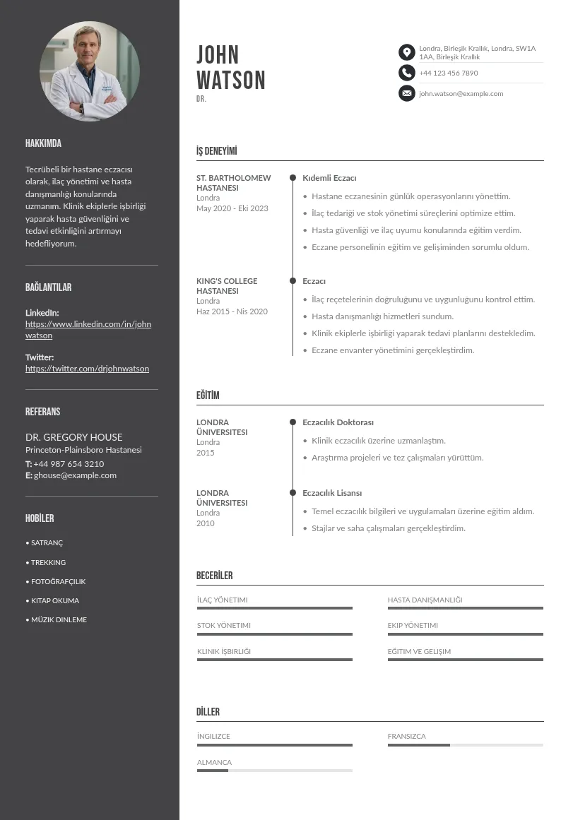 Bir hastane eczacısı için CV, klinik direktöründen İK uzmanına kadar herkese kariyer reçetenizi sunar.