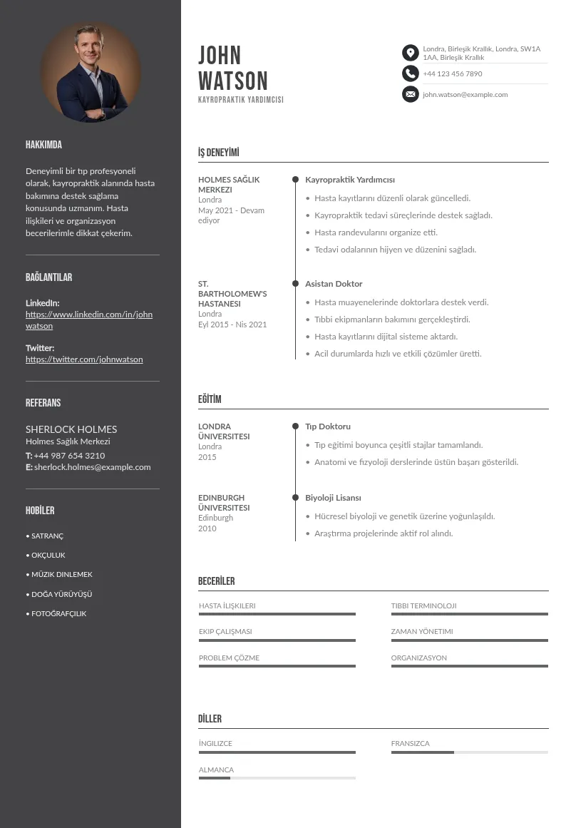 Aşağıdaki örnek özgeçmiş, Kayropraktik Yardımcısı pozisyonu için hazırlanmıştır ve kişisel ihtiyaçlarınıza göre ayarlanabilir.