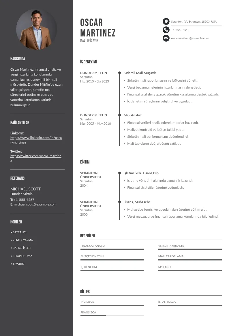 Mali Müşavir pozisyonu için özgeçmiş oluşturulacaktır, bu özgeçmiş kişinin eğitim bilgilerini, iş deneyimlerini, yeteneklerini ve referanslarını içerecektir.