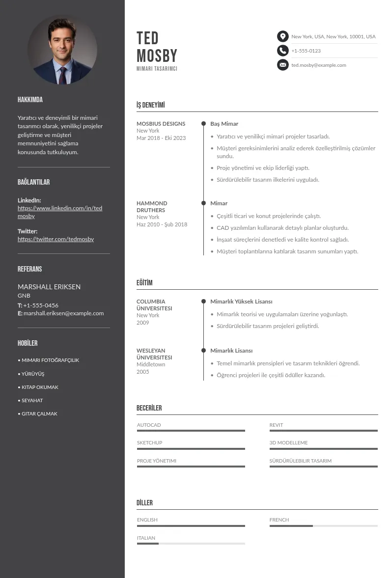 Mimari tasarımcı CV'si, estetik ve yeteneklerinizi işe alımcılar, mimarlık firması yöneticileri ve proje yöneticilerine sanatsal bir eskizle sunar.