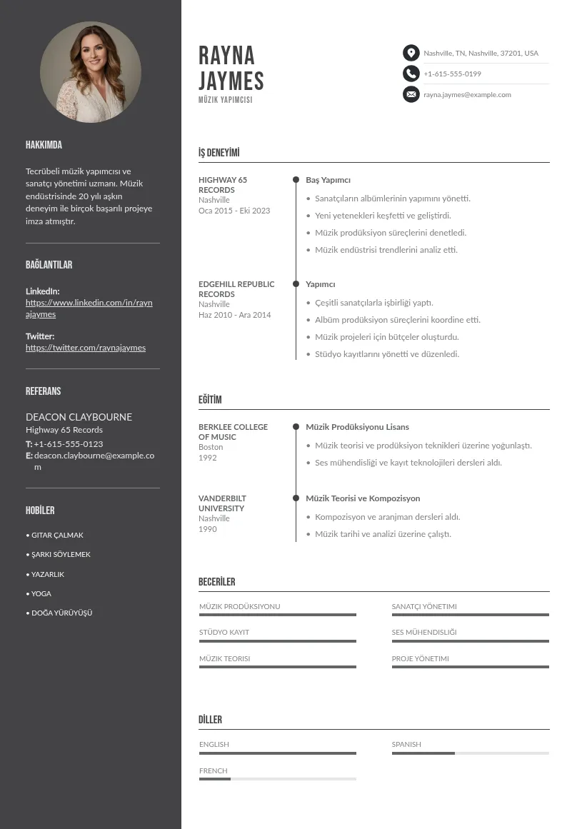 Müzik yapımcısı özgeçmişi hazırlarken, yan taraftaki şablonu ihtiyaçlarınıza göre kolayca özelleştirebilirsiniz. Hemen şimdi şablonunuzu düzenlemeye başlayın ve öne çıkın. Müzik yapımcısı için hazırlanan bu örnek özgeçmiş, kişisel ihtiyaçlarınıza göre uyarlayabileceğiniz basit bir taslak sunar.