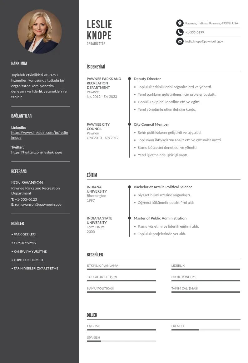 Etkinlik organizatörü olarak kariyerinizi öne çıkarmak için, yan tarafta bulunan özgeçmiş şablonunu ihtiyaçlarınıza göre kolayca özelleştirebilirsiniz. Hemen düzenlemeye başlayın ve profesyonelliğinizi yansıtan bir özgeçmiş oluşturun. Aşağıda, Organizatör pozisyonu için bir örnek özgeçmiş bulunmaktadır; lütfen kendi deneyim ve becerilerinize göre özelleştirin.