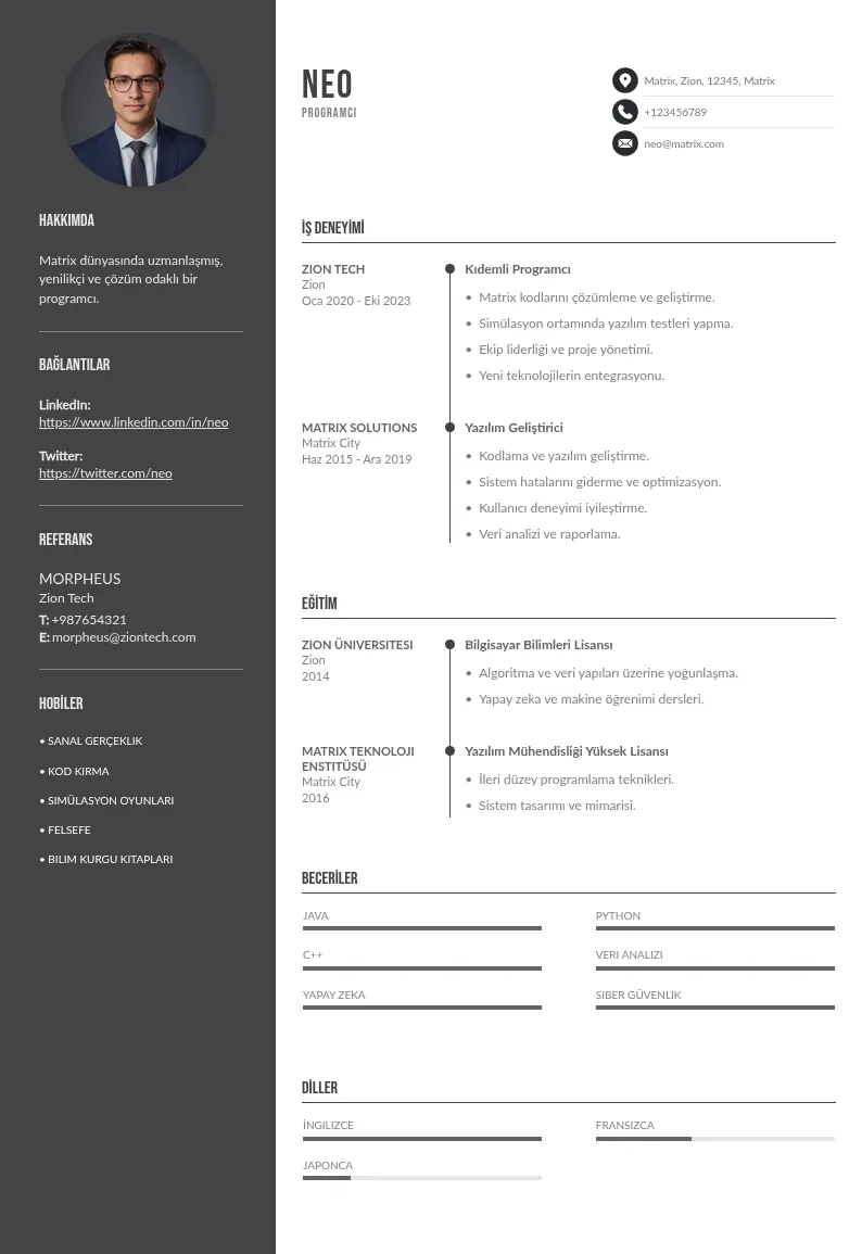 Unutmayın ki, bu rekabetçi iş piyasasında iyi organize edilmiş bir özgeçmiş, bir programcının yeteneklerini ve profesyonelliğini sergilemenin anahtarıdır. Şablonun çarpıcılığı ve okunabilirliği, işe alım uzmanlarının dikkatini çeker ve programlama becerilerinizi öne çıkarır.