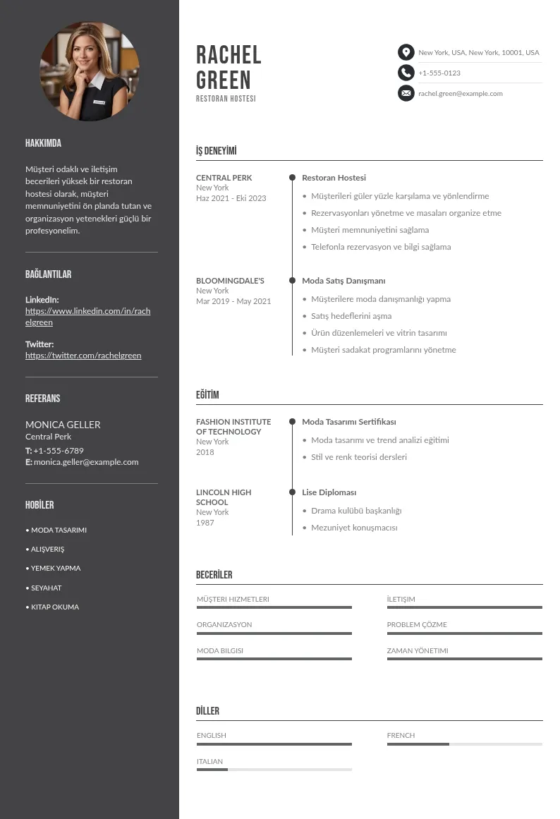 Bu stilistik ayarlarla, restoran hostesi pozisyonu için CV'nizi hem dikkat çekici hem de profesyonel bir hale getirebilirsiniz. Başarılar!