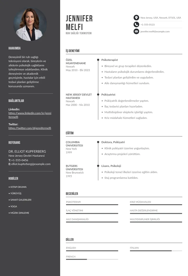 İşte Ruh Sağlığı Teknisyeni pozisyonu için örnek bir özgeçmiş; bu taslağı kendi deneyim ve becerilerinize göre özelleştirebilirsiniz.