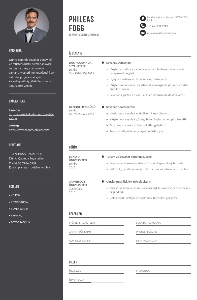 Bu stilistik seçimler, CV'nizin profesyonel ve etkileyici görünmesine yardımcı olacak, seyahat acentesi pozisyonu için en iyi aday olduğunuzu gösterecektir.