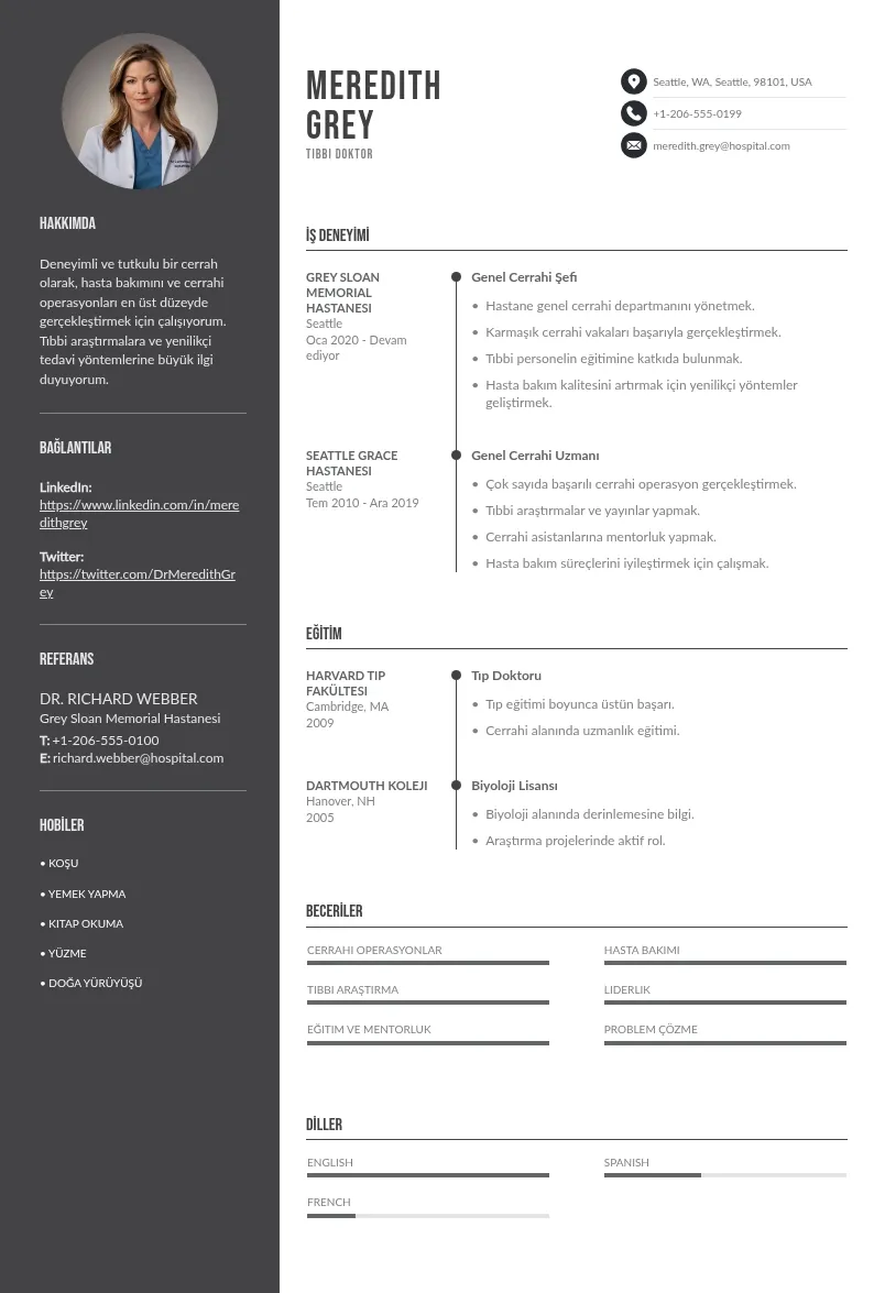 Kariyer Hedefi: Kısa ve net bir kariyer hedefi ile kariyerinizde neyi başarmayı hedeflediğinizi belirtin. "Gelişmiş cerrahi tekniklerde uzmanlaşarak, hastaların yaşam kalitesini artırmayı amaçlayan bir cerrah olarak çalışmak istiyorum."