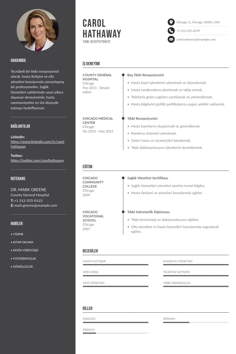 Bu metinle birlikte bulunan örnek özgeçmiş şablonunu, kendi deneyimlerinize ve yeteneklerinize uygun şekilde kolayca özelleştirebilirsiniz. Kendi tıbbi resepsiyonist özgeçmişinizi oluşturmak için hemen düzenlemeye başlayın. Aşağıdaki örnek özgeçmiş, Tıbbi Resepsiyonist pozisyonu için hazırlanmıştır ve kendi deneyimlerinize göre uyarlayabilirsiniz.