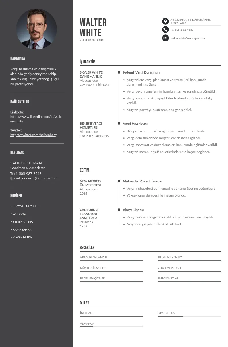 Bu stilistik ayarlarla, Vergi Hazırlayıcı olarak profesyonelliğinizi ve detaylara verdiğiniz önemi vurgulayan bir CV hazırlayabilirsiniz.