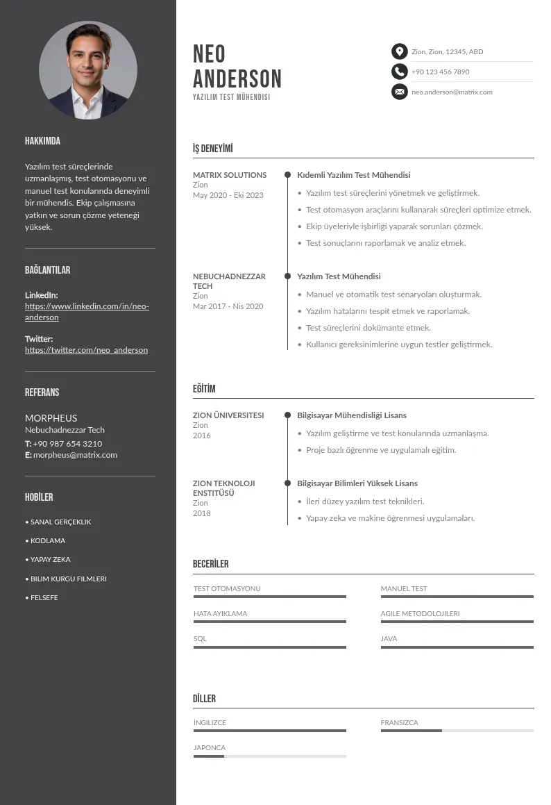 Bu stilistik öneriler, Yazılım Test Mühendisi CV'nizin sadece içerik olarak değil, görsel olarak da profesyonel bir izlenim bırakmasına yardımcı olacaktır.